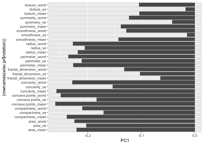 Q9. For the first principal component, what is the component of the loading vector (i.e. wisc.pr$rotation[,1]) for the feature concave.points_mean? This tells us how much this original feature contributes to the first PC. Are there any features with larger contributions than this one?